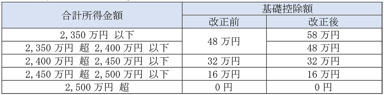 令和7年分以後の所得税について、合計所得金額2,350万円以下である個人の基礎控除額が10万円引き上げられます。
